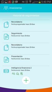 de cada contacto que tienes con tus prospectos, asignarles estados para agruparlos según el avance de tu proceso, filtrar tus prospectos por estado validando cómo avanza cada etapa de tu proceso, programar próximos contactos y recibir recordatorios para que seas la persona que hace lo que dice, crear planes de seguimiento de prospectos definiendo qué acciones se realizarán cada día y al asignar tus prospectos a estos planes, Mi Asistente realizará a tu nombre las acciones que programaste (como enviar correos con información), de esta forma podrás educar tus prospectos poco a poco y darles información de valor sin tener que hacer esfuerzo alguno, esto te permite tener tu prospecto pensando en tu oferta y digerir la información poco a poco.
