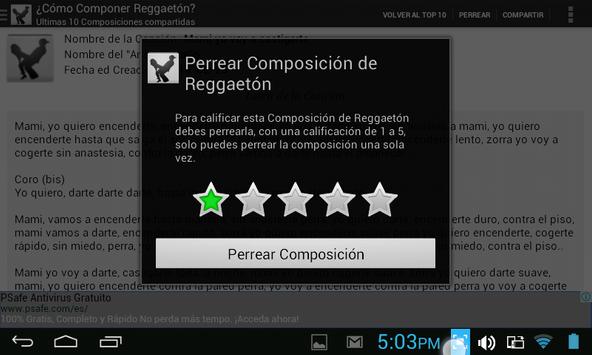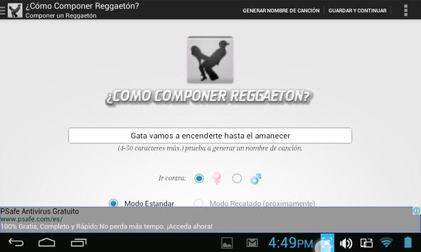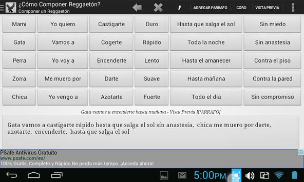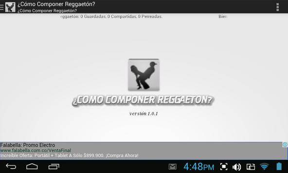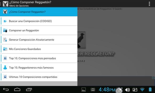 La Aplicación ¿CÓMO COMPONER REGGAETÓN?, está basada y potencia la famosa tabla muy compartida en las redes sociales, en la cual se explica cómo componer reggaetón (a Modo de Parodia), la aplicación agrega varias funcionalidades y potencia la composición de reggaetones y compartirlos en las redes sociales.