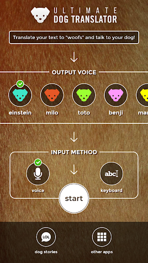 Simply use voice recognition or type your message using the keyboard to translate to dog language. The app will convert your text input to "woofs" so your dog will understand exactly what you're saying.
