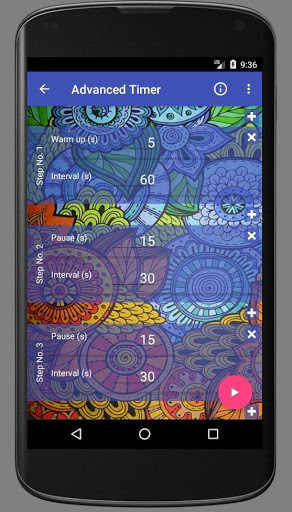 ADVANCED TIMER feature allows you to set up different lengths of the intervals for each step. You can setup adjust also the pause lengths between each step. Moreover, you have the possibility to modify a "warm up" time, that may be needed for the preparation before the exercise. This timer is useful if you want to do e.g. Plank Workout. Any workout with a fixed number of repetitions but with different lengths of intervals or break lengths can be managed with it.