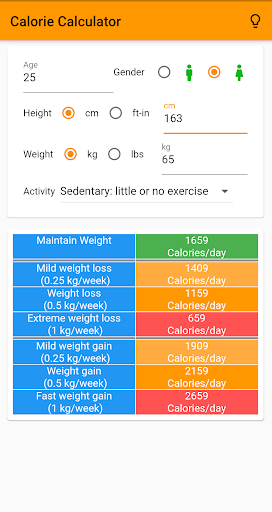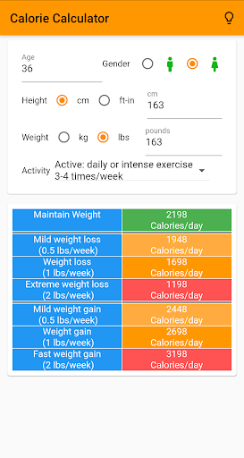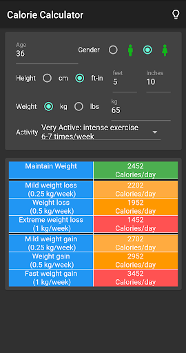 With this app you get the estimated Calories/day for Maintaining, Loosing or Gaining weight based on your goals and physical activity level.
