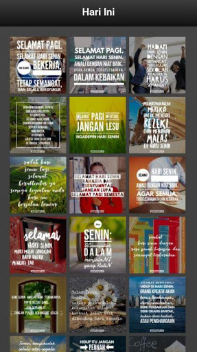 Aplikasi ini berisi kumpulan gambar kata ucapan Selamat Hari Senin, Selamat Hari Selasa, Selamat Hari Rabu, Selamat Hari Kamis, Selamat Hari Jumat, Selamat Hari Sabtu & Selamat Hari Minggu. Didesain dengan tipografi yang cantik dan elegan.