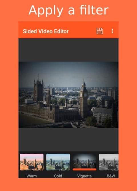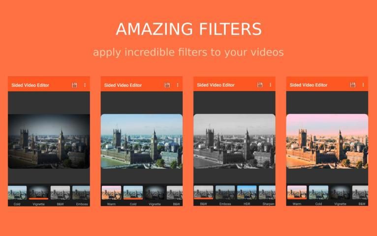 - Apply wonderful filter effects to your video: warm, cold, vignette, black and white, emboss, HDR, sharpen, blur, edge.