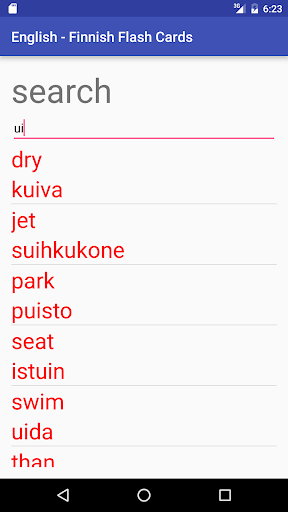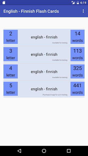 A tiny app that helps you along with learning the basics of Finnish. Containing 1, 2, 3, 4 and 5 letter English words translated to Finnish. Also available are search facilities (free), a shuffle mode (free) to randomise cards as well as a test mode (in-app paid for).
