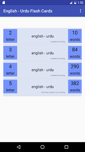 A tiny app that helps you along with learning the basics of Urdu. Containing 1, 2, 3, 4 and 5 letter English words translated to Urdu. Also available are search facilities (free), a shuffle mode (free) to randomise cards as well as a test mode (in-app paid for).