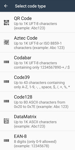 It supports also Aztec Code, Codabar, Code39, Code128, DataMatrix, EAN-8, EAN-13, IFT, PDF 417 and UPC-A.