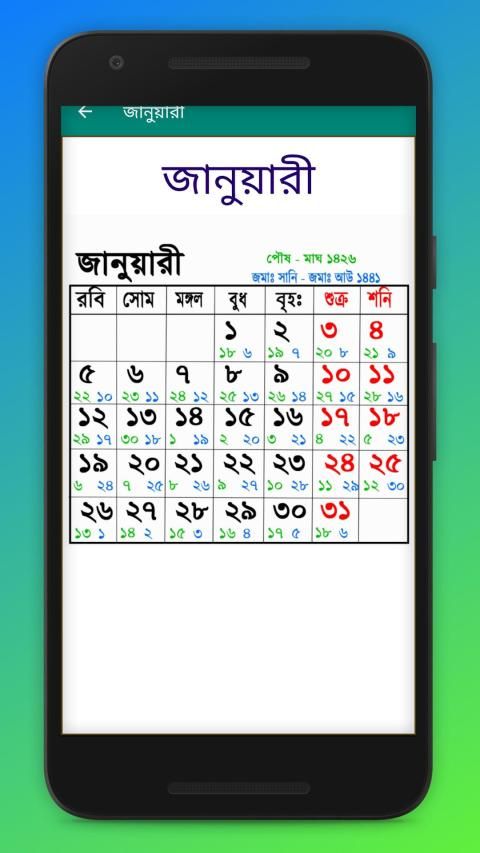বাংলা কেলেন্ডার বা বাংলা ক্যালেন্ডার বা বাংলা কেলেন্ডার এই অ্যাপটিতে আপনারা বাংলা, ইংরেজি ও আরবি এই তিনটি মাসের ২০২০ সালের দিনপুঞ্জিকা একসাথ পাবেন। তাছাড়া আপনারা বাংলা কেলেন্ডার বা বাংলা ক্যালেন্ডার বা বাংলা কেলেনডার অ্যাপটিতে ছুটির তালিকা আকারে দেওয়া আছে। আপনারা ছুটির তালিকা থেকে আরো জানতে পারবেন সরকারি ছুটি। যারা সরকারি চাকুরি করেন তাদের জন্য সরকারি ছুটির তালিকা অ্যাপটি রাখা খুবই দরকার। সরকারি চাকুরি জীবিদের জন্য সরকারি ছুটির তালিকা রাখা খুবই প্রয়োজন।