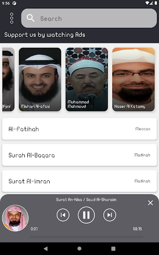 The application of the Holy Qur’an with the voice of the reciter Saud Al-Shuraim allows you to hear all the surahs of the Holy Qur’an through your phone or tablet with ease and ease through one application that contains all the surahs of the Holy Qur’an without the Internet. Fans of listening to the reader Saud Al-Shuraim, you will not need to pay money to download the application.