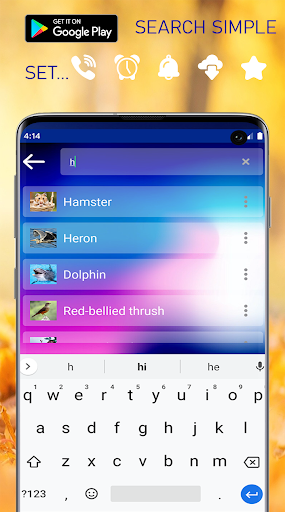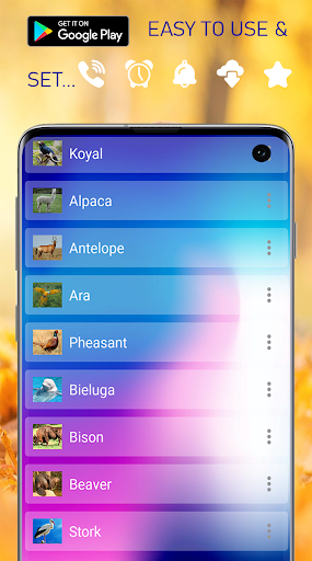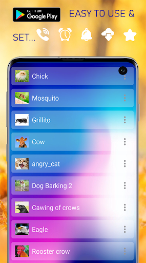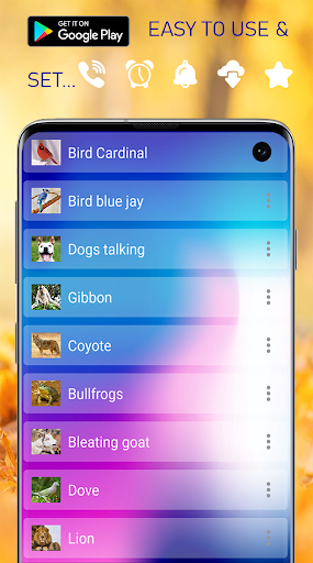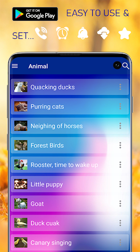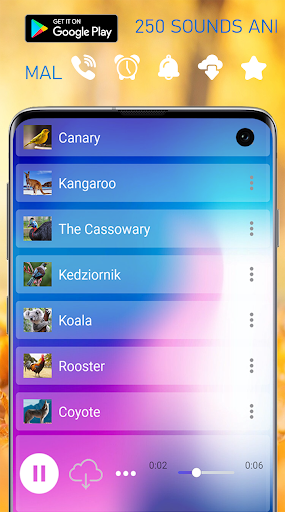from more then 200 HD animal sounds and surprise your friends lion growl, the crowing of the rooster, mooing cow, a cat purring sounds, birds ,Dog, Dove, Duck, Elephant, Leopard, Pig, Sheep, Turkey, Tiger, Ape, and many other animal sounds as free ringtones on your phone.