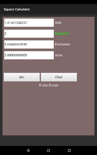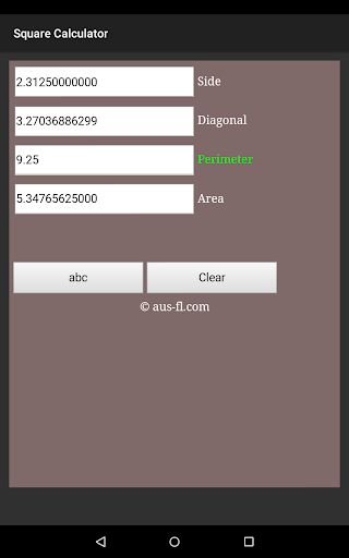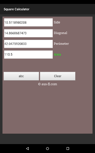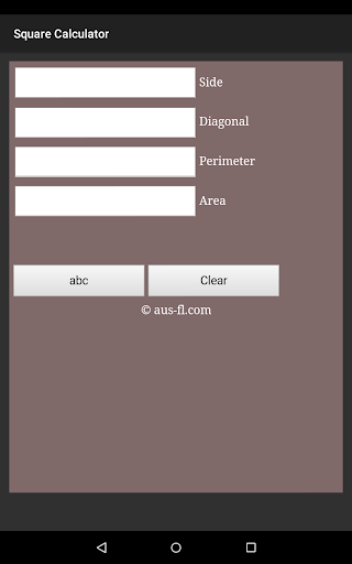 Square Calculator is a unit-less calculator, which means you can put your measurement in any unit of measure you want! Enter a known value and this application will automatically complete all empty boxes.