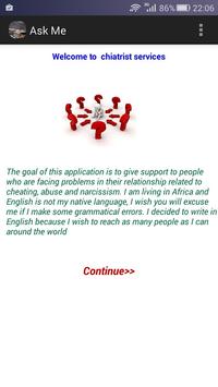 The goal of this application is to give support to people who are facing problems in their relationship related to cheating, abuse and narcissism.