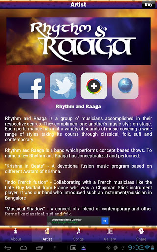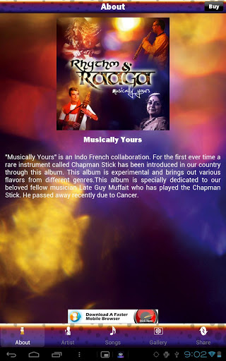Musically Yours by Rhythm and Raaga.This is the Official 39;Monetize Your Music39; App developed by Appytunes for the music album quot;Musically Yoursquot; by Rhythm and Raaga.The mobile application has got 2 versions. The Free Lite App Version has 30 second Sample Previews of all the Songs. You will find wallpapers, lyrics, caller tunes, album details and much more all within this app. The Full Version is available for US 3.99 and has got Full Length Songs for all tracks, the ability to write song comments, youtube music video links and is absolutely AD free. All songs are in 128 kbps mp3 format quot;Musically Yoursquot; by Rhythm and Raaga is an Indo French collaboration. For the first ever time a rare instrument called Chapman Stick has been introduced in our country through this album. This album is experimental and brings out various flavors from different genres.This album is specially dedicated to our beloved fellow musician Late Guy Muffait who has played the Chapman Stick. He passed away recently due to Cancer.Rhythm and Raaga is a group of musicians accomplished in their respective genres. They compliment one another39;s music style on stage. Each performance has in it a variety of sounds of music covering a wide range of styles taking its course through classical, folk, sufi and contemporary.Album Credits:Sangeetha Srikishen and Raghuram on VocalsDavid Moszko on Saxophone From FranceLate Guy Muffait on the Chapman Stick From FranceRanjan Kumar Beura on the Violin From OrissaGopi K Mohan Gopinath on Drums, Percussion and special effectsMusic composed amp; arranged by Gopi K Mohan Gopinath