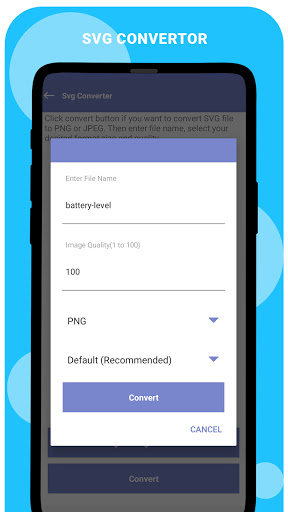 The best svg viewer and svg converter for android tool provides the facility to view your svg format file and convert your svg file to png/jpg/webp format easily . With this svg viewer tools you can easily view svg file easily in offline mode .This application fully supported the offline services to view easily all your svg file content. As you now that png and jpg is a normal image format and the most useable image format which is supported by all android version.
