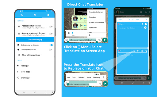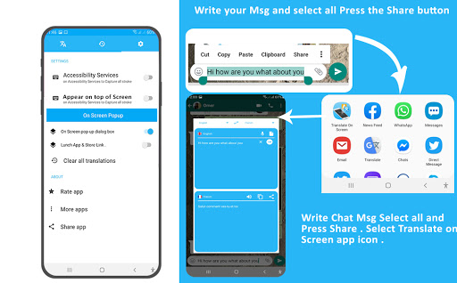 Now a Days there is so many languages and people have social friend from different country and also its languages change from each other and most of the time it is difficult to chat with different language type on social media . so Translate On Screen app provide you direct chat translation facility . Screen Translator translates text right on the screen,you can translates text via shareable translate even when you are surfing the web on browsers , playing games , studding article and many other senario .Translate on screen app let you translate any thing showing on the mobile screen very smoothly .