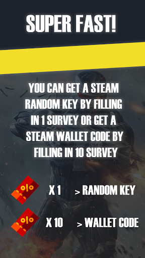 It takes about 5 minutes to complete a questionnaire and you receive your Steam gift codes in return. The first survey is for getting to know you, so the first survey will not give you coins. However, after the first survey, the surveys give you 50 coins and the value of 1 code is 50 coins. We'll give you your gift code very quickly, easily and for free. You will receive your gift code within seconds.