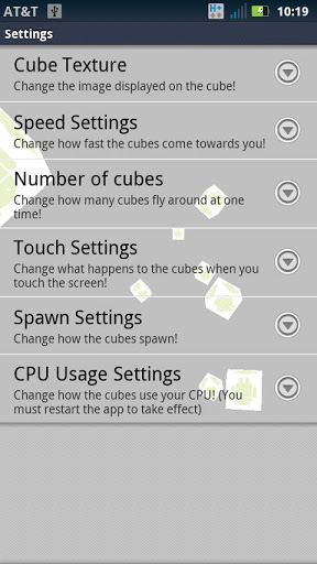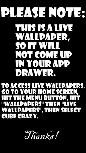This is a really cool Live Wallpaper, created by myself Ben Paul, that is totally worth the $0.99! This wallpaper will throw a bunch of 3D cubes right at you! This endless 3D cube onslaught is sure to make your Android phone stand out from the others! Choosing from many different settings, you can make this wallpaper YOURS and have it how you want it.