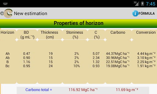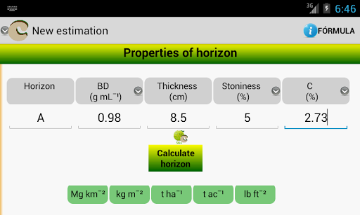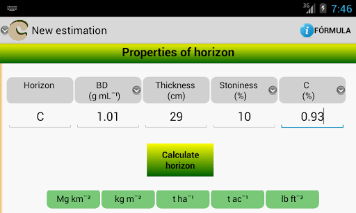 The App is in "Play Store" is easy to use because the common units of measurement of soil properties, as employed: bulk density in mg mL-1; horizon thickness in cm; coarse fragments or stony percentage and organic carbon percentage.