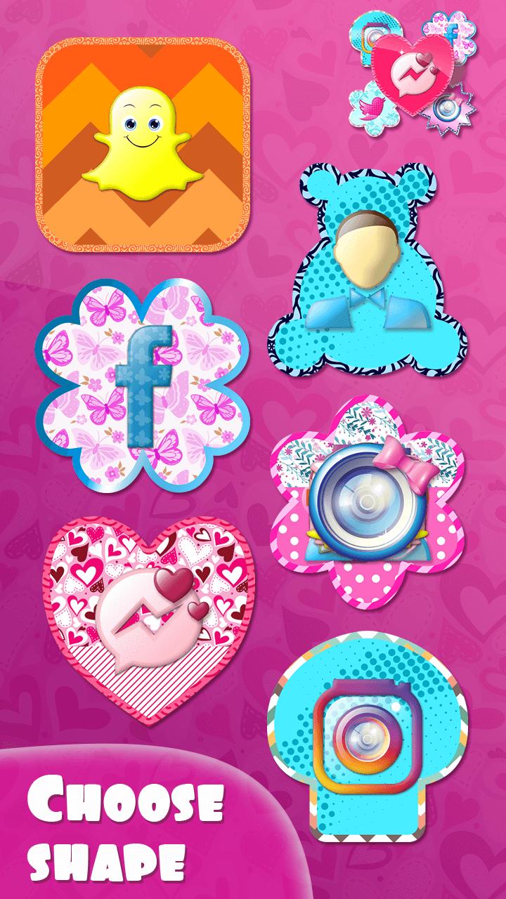 ⇨ Pick one of the ready-made icons or make a completely new icon by choosing an awesome background picture, frame, stickers and glow effects;