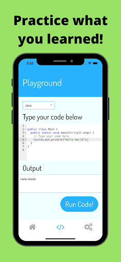 With the in-app IDE, with support for lots of different languages, you can practice what you learned from the lessons easily within the app. Try running programs in languages like C, C , Python, Java, and much more! With the growing Playground, there will always be more to do when it comes to in app practice.
