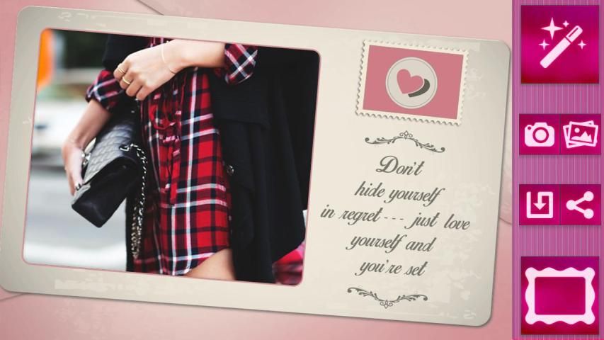 Get Cute Girlish Photo Editor, a useful and totally free app that will add magical effects to your love pictures! Be your own photo editor, chose from a variety of wonderful frames for pictures and adjust them to get the best selfie pics! Try out new love pic frames for couples from this collection that will intensify your feelings towards the love of your life and can be perfect as wedding picture frames, Valentine's day or any other occasion. Add some new life to your old pictures! Use cute photo frames to make your pics look fresh and beautiful. Cute Girlish Photo Editor free for Android™ is now here, ready to help you beautify the best moments of your life. Enjoy the photofunia!