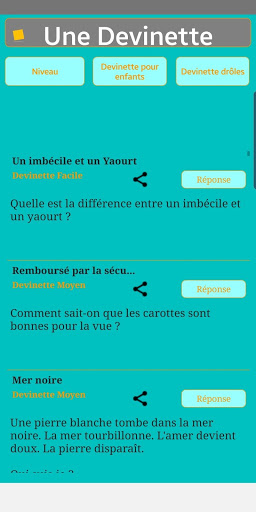 Une devinette est une question où il faut trouver la réponse. La question peut être plus ou moins difficile. L'application propose différents niveaux de difficulté, des séries de devinettes drôles et aussi pour enfants.