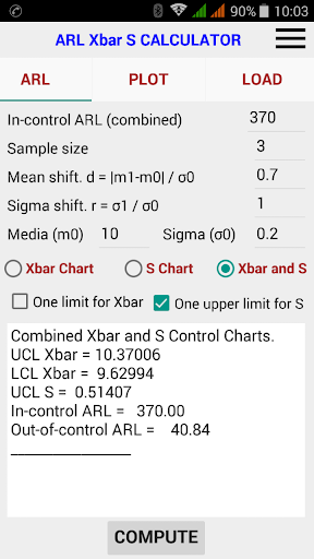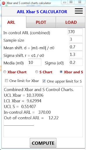 This application computes the ARL for the Xbar, S and Xbar-S control chart for different mean and sigma shifts. It shows where to place the control limits for different in-control ARLs.