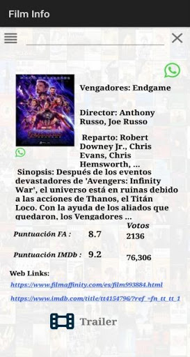 Film Information !!!, Do you want to know information about any movie that exists? Do you want to quickly and briefly know who is the director, interpreters or the synopsis? And you can also know what people think about what the movie has already seen, you will see from each movie how many votes it has received and what average score is extracted from all these votes. Make sure before watching a movie of the probabilities that you have that you like it more or less comparing the score of your favorite movies with the scores that are reflected in the application. All information is obtained from the web www.Filmaffinity.com.