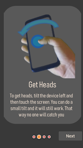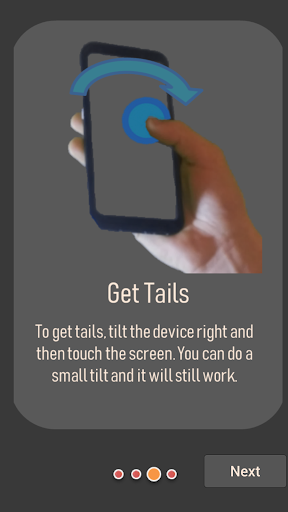 Tap the screen and tilt device right to get Tails. Tap tilt left to get Heads. No one will never catch you. Let your friends choose heads or tails. Flip the coin and win. Always.