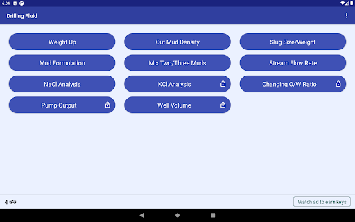The App is a mud calculator. Daily mud calculations and formulas are placed into it. this App is designed with a clear and sharp view to make it easy to use. The app is compatible for smartphones and tablets and supporting portrait and landscape screens. It's a handy tool for any mud engineer in oilfield. This software can calculate for Weight up, cut mud density, slug size or slug weight, Changing OWR and etc.