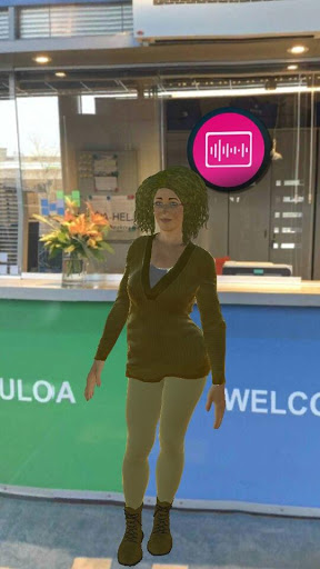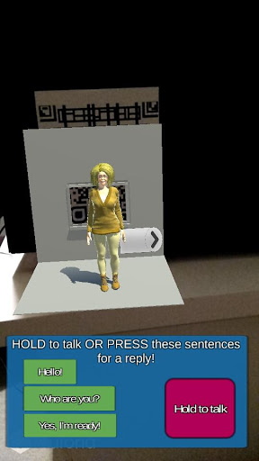 For talking to the AR character, hold down the button and speak the sentences, or alternatively push the sentences on the left.