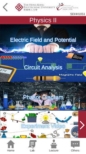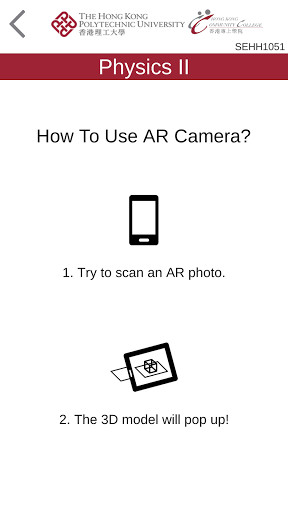 There will be AR markers on lecture notes for viewing the electric fields and electric potentials in 3-dimension generated by various charges objects, like, ring, disk, electric dipole, etc. The strength of electric fields and potentials of different charged objects can be altered by controlling the sliding buttons in the app. The phasors relationship between voltage and current of resistor, inductor, capacitance, various powers in AC circuit will be represented by animation. Users can try the AR markers provided by this app to construct an electric circuit for analysis. Also, laboratory videos and AR-assisted laboratory manuals are included in this app to assist students in performing experiments.