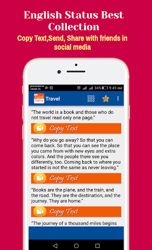 English status quotes which you want to keep them as Status & share your daily status in social media for good personality. in this apps we added maximum common category status which is very much needed in daily life & Event. This application consist of unique and wide variety of status quotes of about 1,000 of varied 15 categories .It is designed for those who want to exhibit their personality