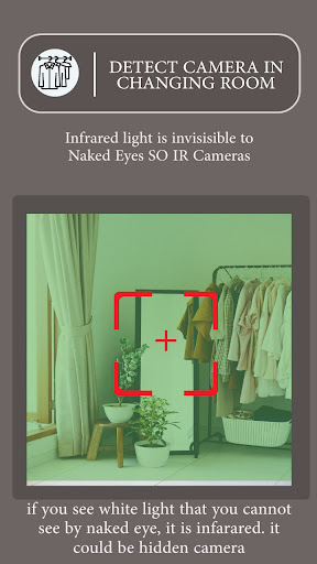 IR stands for Infrared Camera Detector is easily detect hidden camera 📸 and spy app if you can click on the infrared camera detector button and appear camera screen and focus on your target you move your phone to your targeted place your camera focus on a red light you must think this is a hidden camera and nanny camera this hidden IR camera detector or hidden devices detector is the best solution of your family privacy.