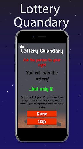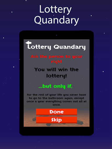 -Ask one of your friends whether they would be willing to take a winning lottery ticket with a usually horrifying catch! Group discussion of the Quandary is highly encouraged as well! For example: Win the lottery, but you lose an arm...