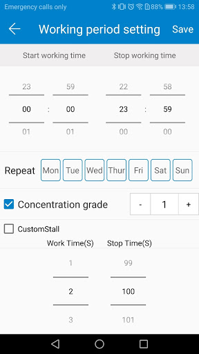 -Bluetooth contriving, including working hours,days in week,Concentration grade