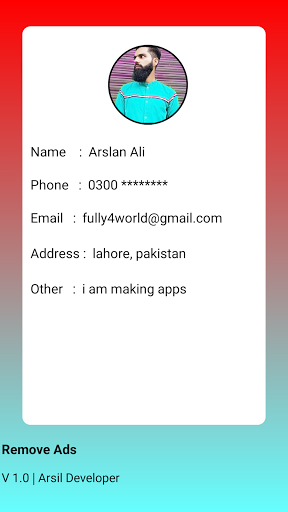 Now you can save anybody profile with his own Photo in new look . and you can change background and front ground colour and also change his text colour you can save any person ID easily and Fast by this APP.