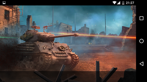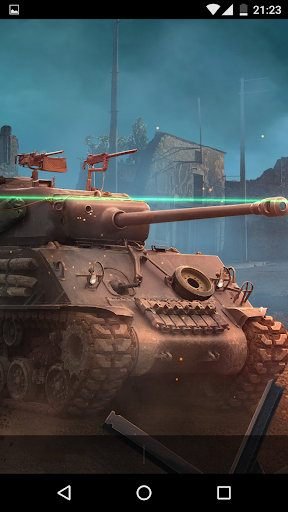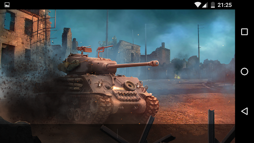 Beautiful and atmospheric live wallpaper shows Sherman M4 tank of WWII in furious battle in ruined town.