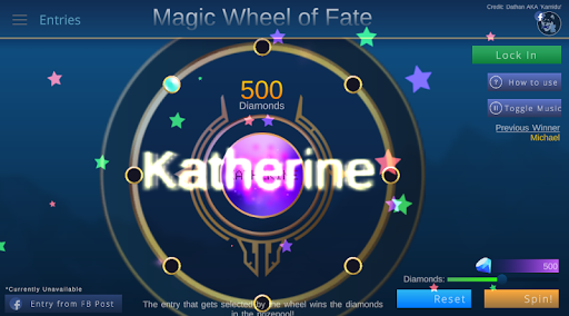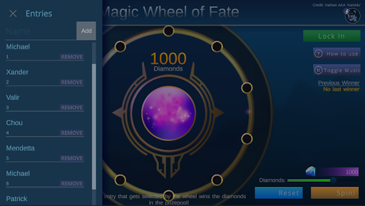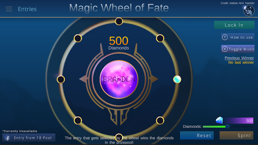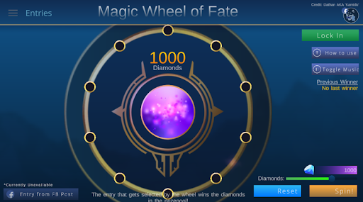 streamers, gamers, or anyone wanting to host a giveaway. Contestants are added to a spinner and then are randomly selected to win the reward in the prize-pool. Currently designed for hosting Mobile Legends diamond giveaways, but it can be used for all your RNG needs!