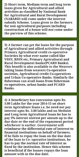 3.A beneficiary has concession upto Rs.3.00 Lakhs for the year 2014-15 on short term Agriculture loans i.e, he need not pay interest upto Rs. 3.00 lakhs and on Meduim and Long term Agricultural loans he has to pay 3% interset nterest per annum up to the due date or the end of the repayment period whichever is earlier. Government will reimburse the differential rate of interest to financial institutions on behalf of farmers.