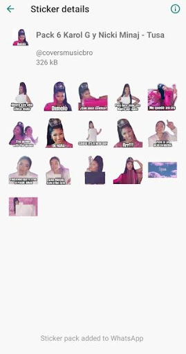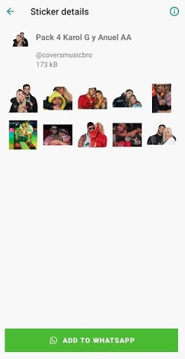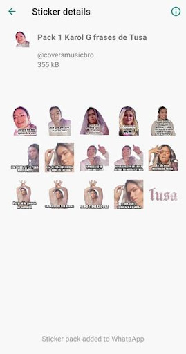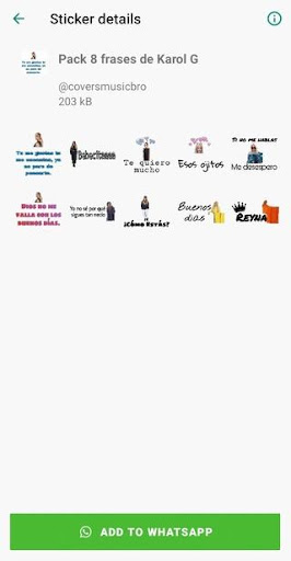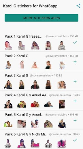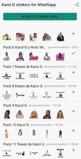 التطبيق لديه ملصقات Karol G بعض دون عبارات وغيرها مع عبارات. يمكن إيلاء الملصقات للاستخدام من قبل WhatsApp. سيتم تحديث التطبيق باستمرار بحيث يكون لديك ملصقات جديدة.