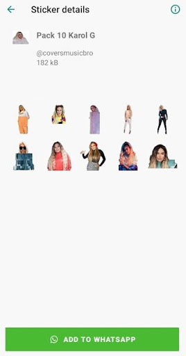 يحتوي التطبيق ملصقات (ملصقات) من Karol G بعض دون عبارات وغيرها مع عبارات. يمكن تنزيل الملصقات لتكون قادرة على استخدامها بواسطة WhatsApp. سيكون التطبيق تحديث باستمرار بحيث يكون لديك ملصقات جديدة.