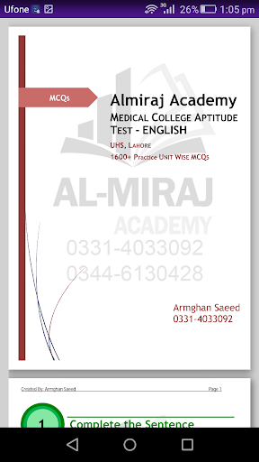 This app is made by ALmiraj Academy Timber Market Lahore and Distributed by Armghan Saeed. These MCQs are based on the latest syllabus given by UHS. We have collected more than 30,000 MCQs from different sources. These are available in different apps according to their subjects.
