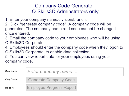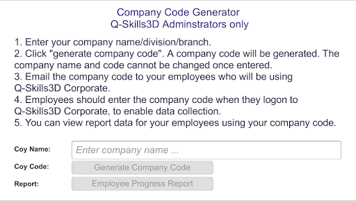 This app generates a company code to be used by employees for the company/division. It is entered once when employees log-on for the first time.