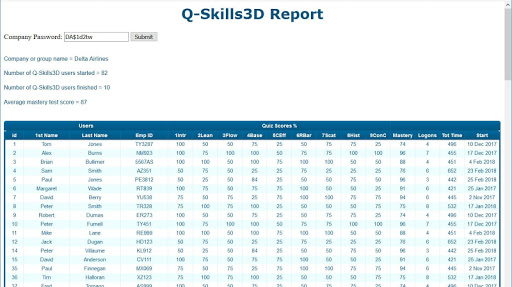 Training data for this company code is then reported to the company administrator. The report shows time and progress in the course, quiz scores and mastery test scores for all users logging in using the company code. The report may be sorted by column title.
