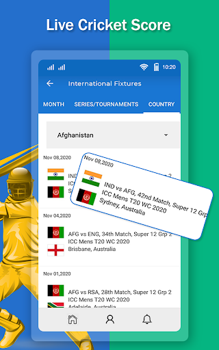 - Notifications for live matches with Upcoming and recent matches detail.