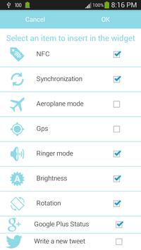 Using Setting widget you can have at your fingertips many settings, just a single tap to turn on or off whatever you like to see on your home screen.