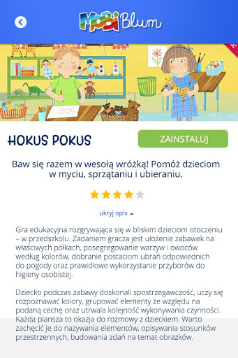Gra edukacyjna rozgrywająca się w bliskim dzieciom otoczeniu – w przedszkolu. Zadaniem gracza jest ułożenie zabawek na właściwych półkach, posegregowanie warzyw i owoców według kolorów, dobranie postaciom ubrań odpowiednich do pogody oraz prawidłowe wykorzystanie przyborów do higieny osobistej.