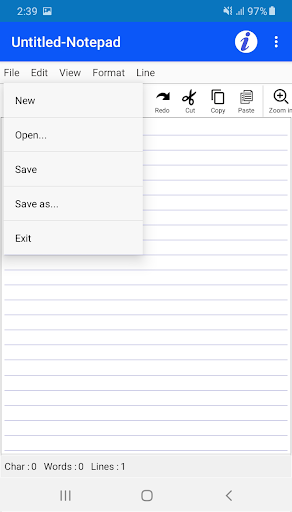 Like Classic notepad Editors, you will find Open file and New File options with Save and Save as file choices in the File menu.