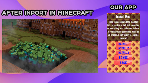 DISCLAIMER: This is an unofficial application. The name, trademark and assets are the property of the owner Mojang AB. The application helps to install and familiarize yourself with the mod for the Minecraft game, this is not a game, but an add-on with instructions! If you believe there are trademark infringements that do not fall within the "fair use" guidelines, please contact us by email.