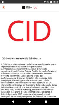 Il CID Centro Internazionale per la formazione, la produzione e la promozione della Danza è nato per iniziativa dell’Associazione Incontri Internazionali di Rovereto, organizzatrice del Festival Oriente Occidente, e della Provincia Autonoma di Trento, con la collaborazione del Comune di Rovereto e del MART. La sua attività spazia dal perfezionamento di giovani danzatori, alla residenza delle Compagnie, allo sviluppo anche in senso teorico delle conoscenze in ambito coreutico e vuole costituire sia un riferimento significativo per la crescita della cultura della danza in Italia sia un punto di scambio a livello europeo.